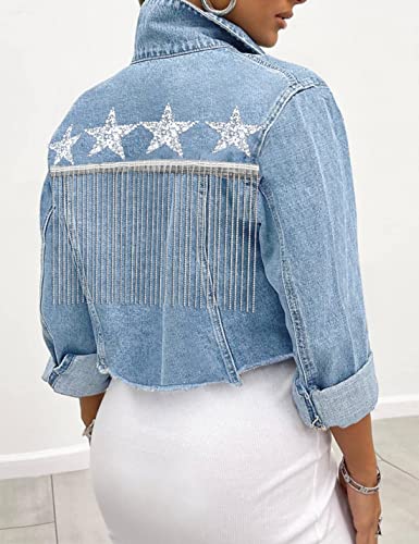 Womens pop cropped jean jacket featuring beads fringe at back ,two chest pockets,Long sleeve, stand collar,cropped length , single breasted front button closure,Rhinestones tassel at the back, star pattern and unique design
