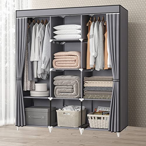 KEKIWE Portable Closet, 51 Inch Wardrobe Closet for Hanging Clothes with 2 Hanging Rods, 8 Storage Organizer Shelves for Bedroom, Durable and Easy to Assemble, Grey