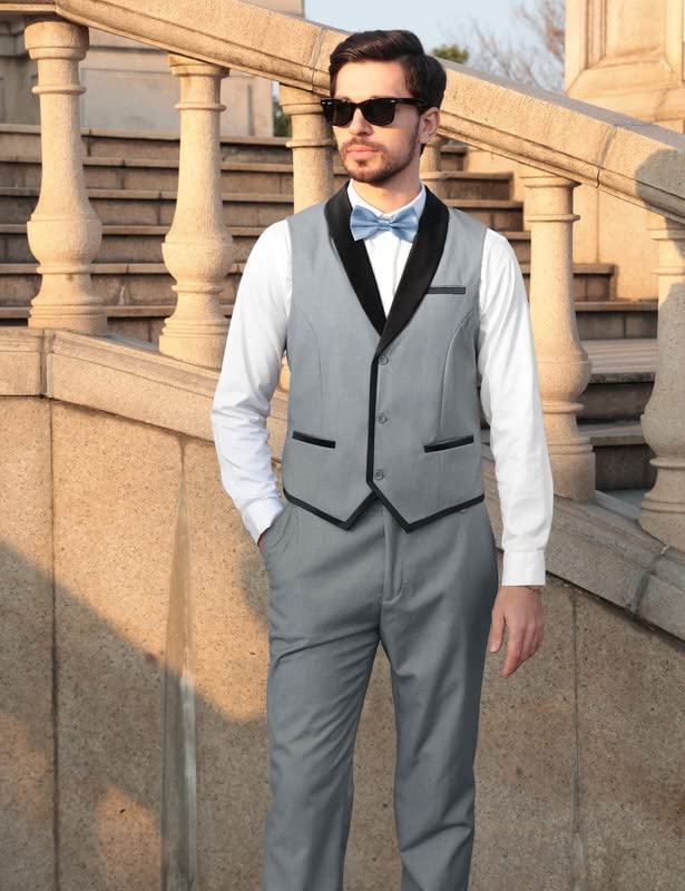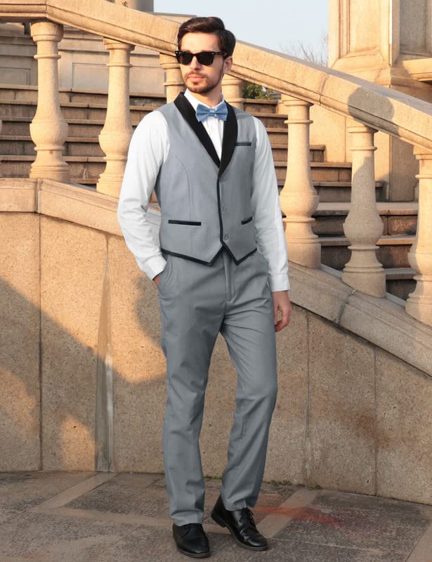 【Feature】Vest: shawl collar,three button,v-neck,smooth back and adjustable back tie,slim fit style; Pants:flat front,zippered fly,button end and adjustable waist tab.Boasting a classic design in a standard regular fit.Profit from top-notch tailoring for a look that’s not just eye-catching, but comfortable too.