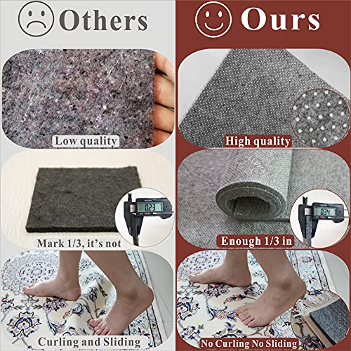 【DOUBLE-SIDED NON-SLIP 】 100% felt pad + double-sided rubber, Provides up to twice the grip, firmly holds the carpet in place, add extra thick cushion and floor protection under your carpet. With sustainably sourced felt, this rug pad will reduce long-term damage and floor discoloration from your rug’s backing, and prevent wrinkling during daily use or when children or pets play.