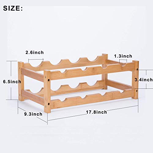 This wine rack countertop can store 8 bottles of wine (Size: 17.5”L x 10”W x 6.49”H) , it fits for an standard 750ml wine bottle; 2-Tier compact design allows it to save a large number of space and hold enough wine, and horizontally placed design give protection to wine from oxidation