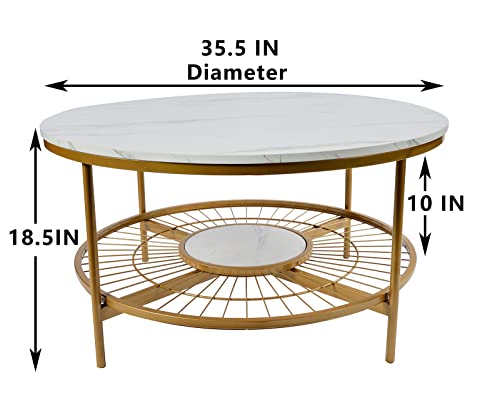 Round Coffee Table for Living Room, Modern Coffee Table with Sun Shape Circle Open Storage,Marble Wooden Tabletop and Sturdy Metal Frame, White and Gold