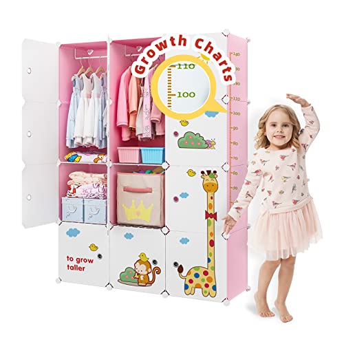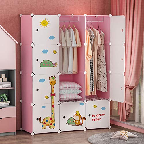VIPZONE Kids Wardrobe Baby Dresser Children Bedroom Armoire Clothes Hanging Closet with Animal Stickers, Pink, 12 Cubes