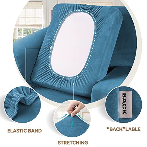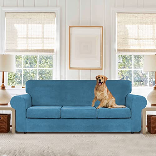 WEERRW 4 Pieces Velvet High Stretch Couch Covers for 3 Cushion Couch Sofa Slipcovers, Washable Furniture Protector with Non Slip Elastic Bottom, Feature Soft Plush Fabric, Peacock Blue, Large