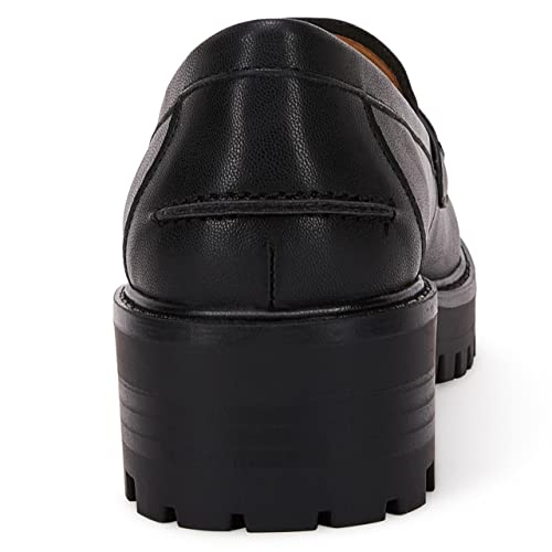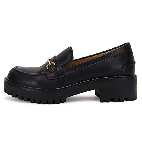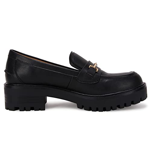 Womens Lug Sole Platform Mid Chunky Heel Loafers Classic Round Toe Slip On Office Uniform Oxfords Shoes with Metal Chain