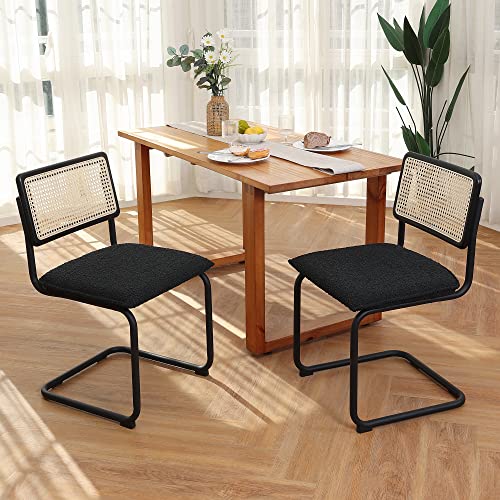 ♔MATERIAL: Stained rattan in red oak tone is artfully hand-woven to create this graceful backrest. It’s cheerful and eye-catching to pair high-quality boucle fabric seat filled in high-density sponge, having the advantages of permeability and comfort. The breathable mesh rattan backrest helps to ventilate rooms and dissipate heat, maintaining a cool and dry sitting feeling. Along with the optimal material, this distinctive dining chair is nearly prefect.
